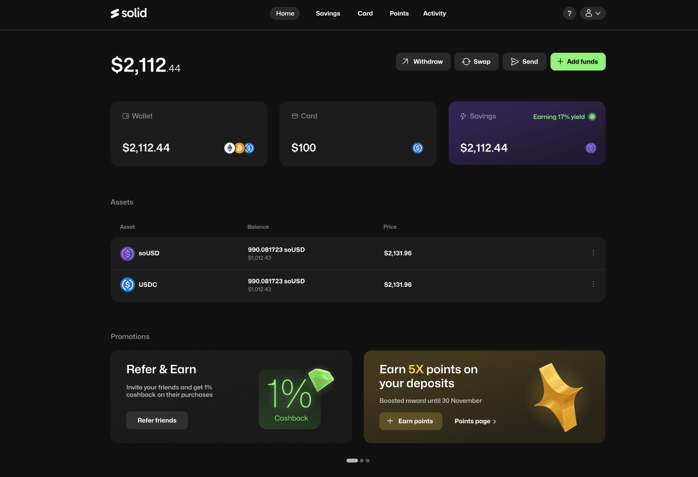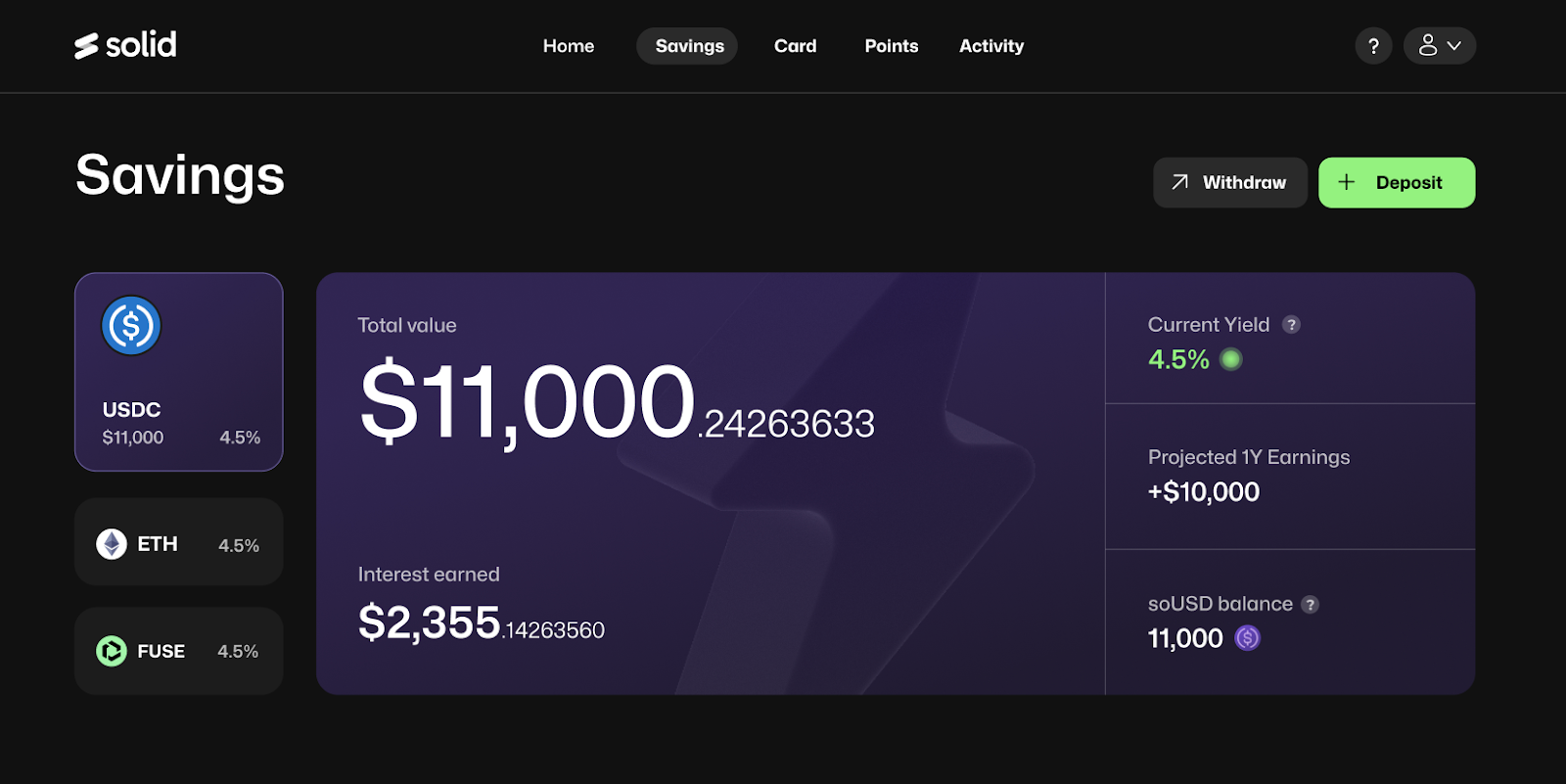 A new earnings nudge explains, in plain terms, how much you earn per year for every $1,000 kept in Solid. This number is dynamically indexed to current yield, making returns easy to understand without needing to interpret percentages.